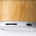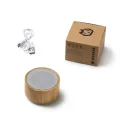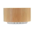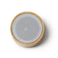 Altavoz inalámbrico redondo con cuerpo de ABS blanco y bambú natural. Botones y rejilla en color blanco. Función radio FM, manos libres, ranura para tarjetas mini SD y potencia 3W. Batería recargable. Cable incluido. Base anti-deslizante. Materil Bambú y ABS blanco. Presentación en caja diseño eco