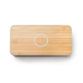 Altavoz bluetooth con base de carga inalámbrica. Cuerpo de fibra de trigo y superficie de bambú natural. 5W de potencia de altavoz y salida inalámbrica de DC5V. Batería recargable. Fibra de trigo y bambú natural. Presentación en caja de diseño eco. Green Ideas