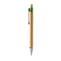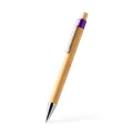 Bolígrafo con cuerpo y pulsador elaborados en bambú. Cuenta con clip y punta con acabado metálico y detalles translúcidos en color. Tinta azul.