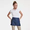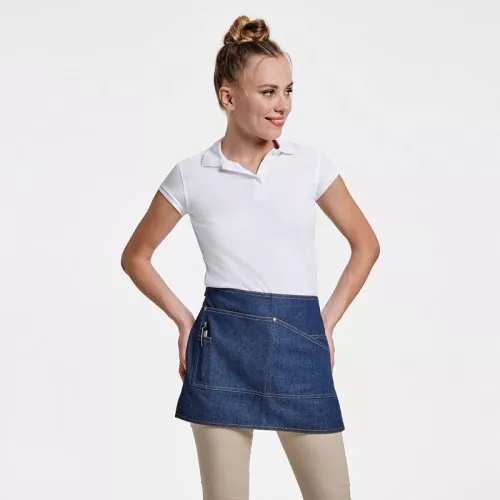 Características:Delantal corto en tejido vaquero: 1. Cuatro bolsillos frontales con remaches, uno de ellos especifico para el bolígrafo. 2. Cintas laterales a contraste para lazada.* 72% algodón / 23% viscosa / 5% poliéster, 225 g/m². * Modelo para alimentación. * Etiqueta removible.