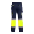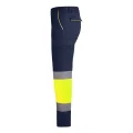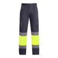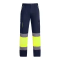 Pantalón largo multibolsillos de hombre forrado de alta visibilidad. Combinado en dos colores y cintas reflectantes. Detalles flúor a contraste en bolsillos. Forro interior en tejido polar. Cintura ajustable elástica en la parte trasera. Dos bolsillos frontales. Dos bolsillos traseros con tapeta y cierre de velcro. Dos bolsillos laterales de fuelle con tapeta y cierre de velcro.Dos capas:Exterior: 80% poliéster y 20% algodón, sarga de 235 g/m² Interior: 100% poliéster forro polar, 185 g/m²
